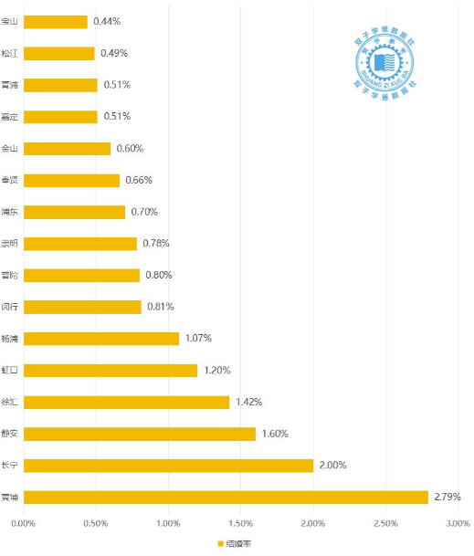 上海市各区的结婚率,最高的是黄浦区,排名第二的是长宁区,排名第三的是静安区,排名第四的是徐汇区,排名第五的是虹口区,排名第六的是杨浦区。