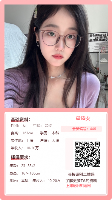 学历方面,本科毕业于上海一所外国语大学,硕士毕业于香港一所知名大学,学的是财务相关专业,还持有CPA会计师资格证书。目前从事财务工作,年收入25w左右。在上海有三套房,婚房145平方,生活安稳。